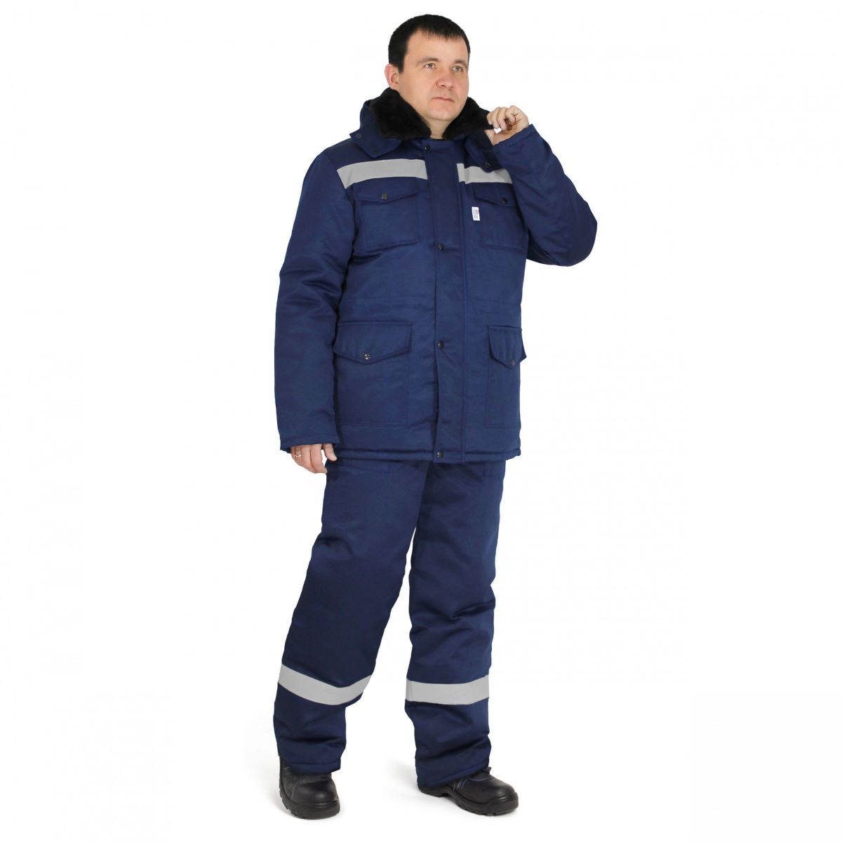Куртка со светоотражающими полосами, с центральной бортовой застежкой на молнии, с ветрозащитным клапаном на кнопках.