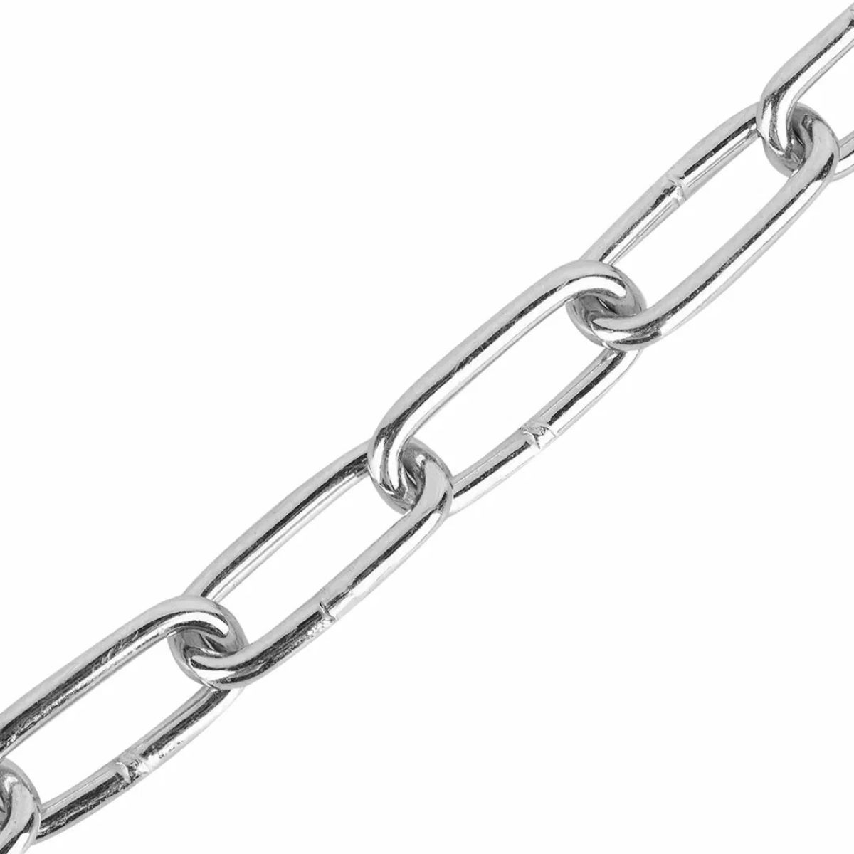 Цепь DIN 763 имеет малый коэффициент растяжения. За счет большой длины звена, цепь позволяет легко закрепить укоротить, сделать петлю методом звено в звено. Цепь длиннозвенная изготовлена из углеродистой стали класса 2, сварная, не применяется для подъема грузов. Размер определяется диаметром прутка звена цепи.Разрушающая нагрузка ,не менее 1400 кг.